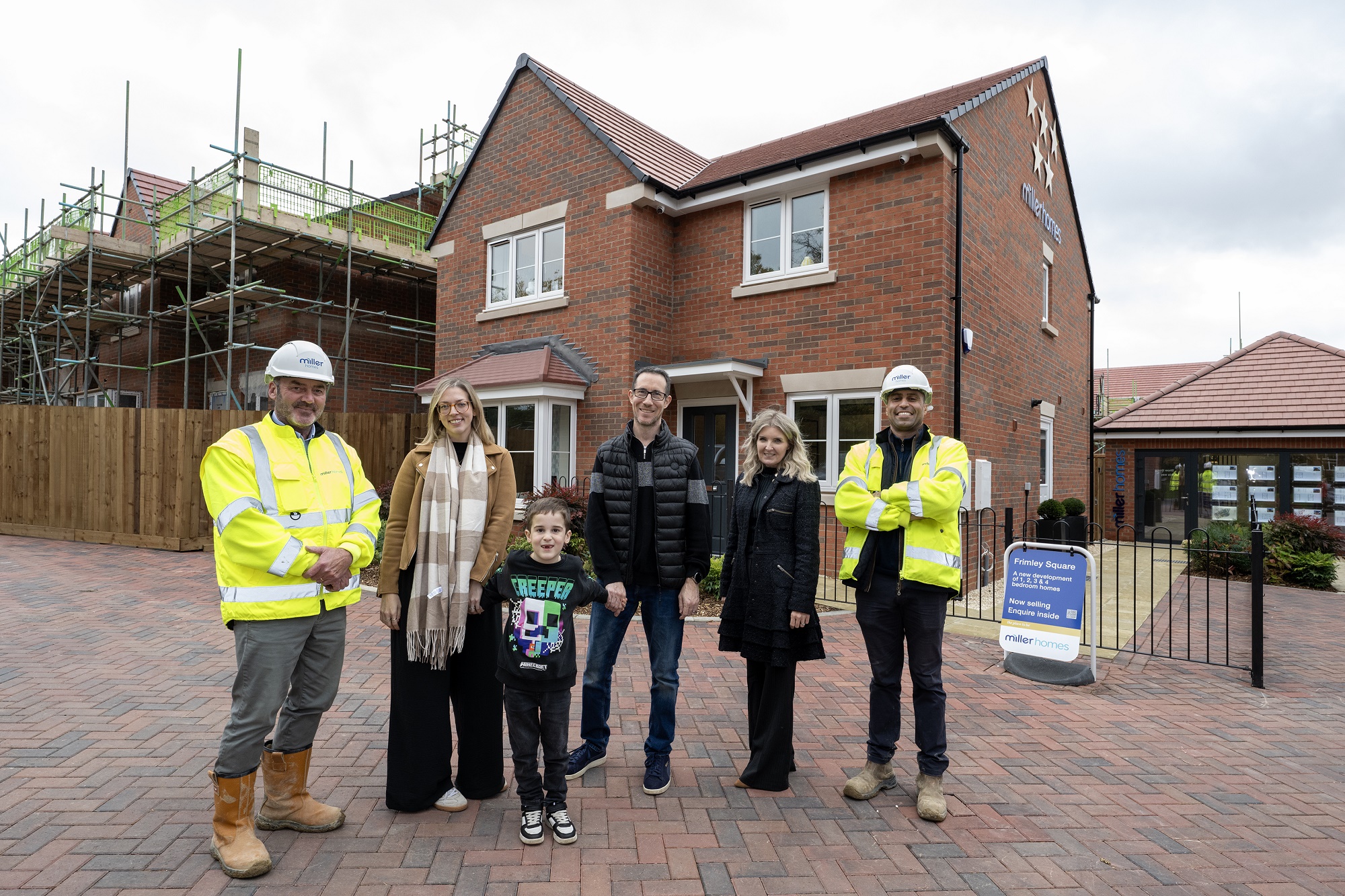 Louie Thomas, parents Amy and Dave, Miller Homes sales manager Natalie MacLeod and Frimley Square site managers Gary Pullen and Mo Femmouri at the development in Frimley