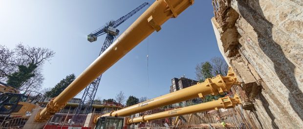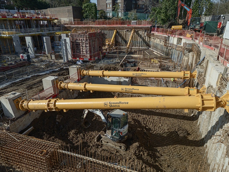 Groundforce Shorco has supplied nine of its modular hydraulic props – including three of its high-capacity MP375 units – to provide support for a basement excavation at a sensitive location in north London.