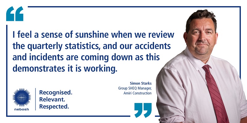 In this uplifting NEBOSH case study, Simon Starks, Group SHEQ Manager at Amiri Construction, reflects on his journey from joinery to leading health and safety initiatives across major UK construction projects. Simon shares how his hands-on industry experience has helped reduce incidents and foster a culture of safety – bringing a real “sense of sunshine” to quarterly reviews.